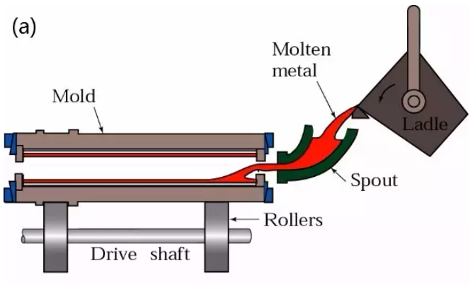 連續(xù)鑄造:是一種先進的鑄造方法,其原理是將熔融的金屬,不斷澆入一種叫做結晶器的特殊金屬型中,凝固(結殼)了的鑄件,連續(xù)不斷地從結晶器的另一端拉出,它可獲得任意長或特定的長度的鑄件。