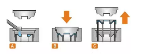 直接擠壓鑄造:噴涂料、澆合金、合模、加壓、保壓、泄壓,分模、毛坯脫模、復位;