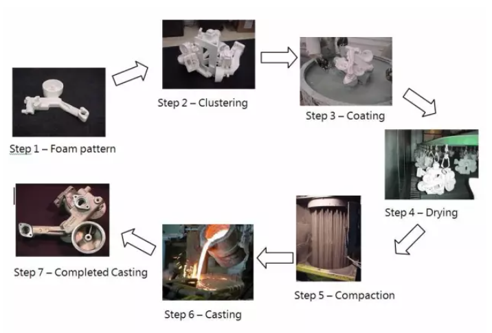 工藝流程:預發(fā)泡→發(fā)泡成型→浸涂料→烘干→造型→澆注→落砂→清理