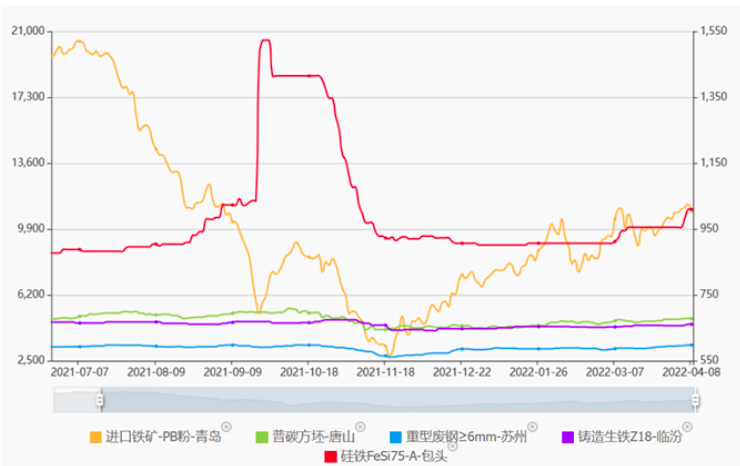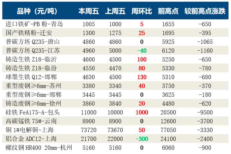 疫情封控有所好轉(zhuǎn),鋼廠陸續(xù)復(fù)產(chǎn),雖交通運(yùn)輸還處于恢復(fù)階段,但鋼廠庫存處于低位,帶動市場成交,鐵礦石價格有所上漲;鋼坯價格因市場流動性不佳,弱穩(wěn)運(yùn)行;生鐵和廢鋼市場偏強(qiáng)運(yùn)行,價格穩(wěn)中上行;鐵合金市場觀望情緒為主,硅鐵現(xiàn)貨隨期貨跟漲;銅鋁市場分化運(yùn)行。