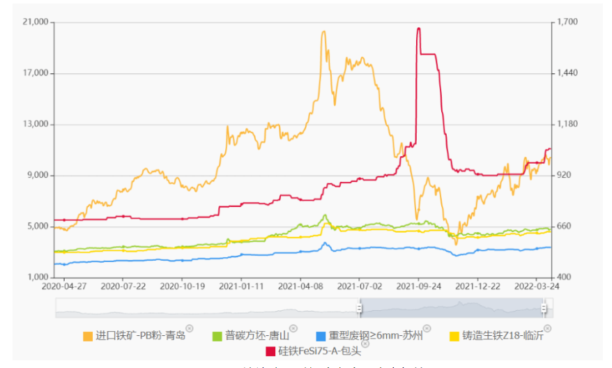原料市場(chǎng)受鋼材降價(jià)、鋼廠利潤(rùn)較低,需求偏弱等原因影響,本周價(jià)格整體呈穩(wěn)中下行趨勢(shì),進(jìn)口礦現(xiàn)貨價(jià)格小幅震蕩,國(guó)產(chǎn)礦價(jià)格偏弱運(yùn)行,市場(chǎng)成交一般。鋼坯、廢鋼、生鐵價(jià)格均受鋼材大幅下跌影響緊跟下降,成交一般。鐵合金價(jià)格維穩(wěn)運(yùn)行,成交偏弱,商家多以觀望為主。銅鋁市場(chǎng)因國(guó)內(nèi)現(xiàn)貨供應(yīng)偏緊,價(jià)格保持中小幅上揚(yáng)。