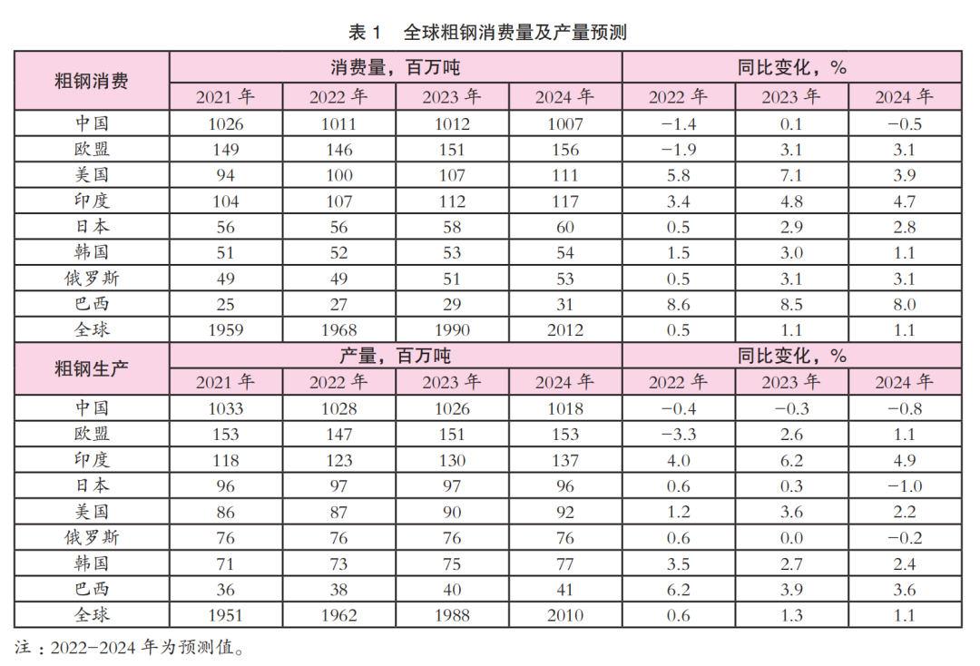 在截至2024年底的展望期內(nèi),與刺激經(jīng)濟相關(guān)的基礎(chǔ)設(shè)施和工業(yè)生產(chǎn)將從當(dāng)前困境中反彈,預(yù)計鋼材需求將繼續(xù)增長,但增長幅度將比較溫和。預(yù)計2023年世界粗鋼產(chǎn)量將增長1.3%,達到19.9億噸;2024年將增長1.1%,達到20.1億噸。然而,供應(yīng)鏈中斷和通脹壓力的加大有可能在展望期內(nèi)抑制或逆轉(zhuǎn)這一增長。
