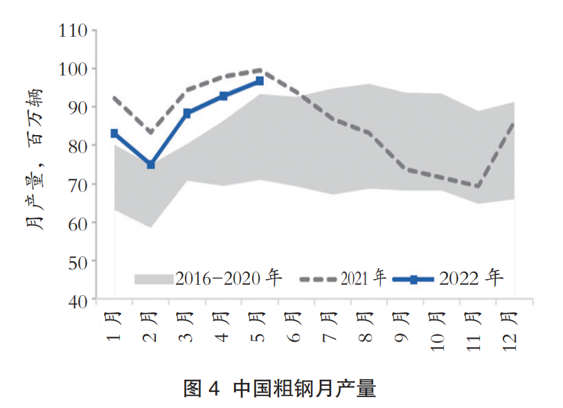 中國粗鋼產(chǎn)量同比下降反映了一系列因素的影響,包括1月1日至3月15日實施的冬季限產(chǎn)措施。這些限制措施旨在減輕中國北方許多省份的污染水平,要求當(dāng)?shù)劁搹S的粗鋼產(chǎn)量比2021年產(chǎn)量低30%左右。2022年1月和2月中國鋼鐵生產(chǎn)也受到了中國政府限制工業(yè)生產(chǎn)活動和確保北京冬季奧運會減少空氣污染努力的影響。唐山是中國最大的鋼鐵生產(chǎn)城市,今年3月和4月唐山市再次實行針對新冠肺炎疫情的限制措施,也可能影響了這一時期中國的粗鋼產(chǎn)量。