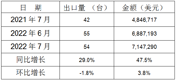 1-7月冷室壓鑄機(jī)共計(jì)出口279臺(tái),同比增長(zhǎng)11.6%。其中:7月份出口54臺(tái),同比增長(zhǎng)29.0%,環(huán)比增長(zhǎng)-1.8%,見表9和表10。