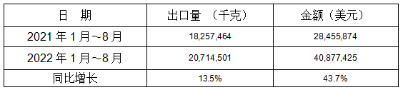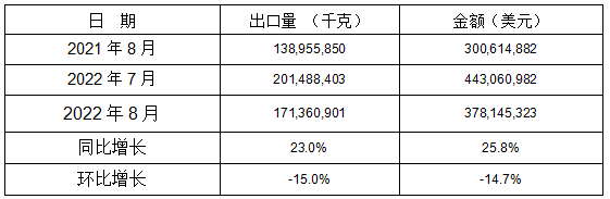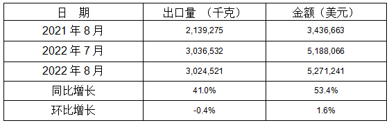 1-8月鑄模及鑄芯用粘合劑共計(jì)出口2.1萬噸,同比增長13.5%。其中:8月份出口0.3萬噸,同比增長41.0%,環(huán)比增長-0.4%,見表11和表12。