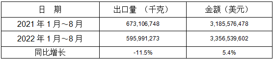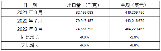 1-8月鋁合金車輪共計(jì)出口59.6萬噸,同比增長-11.5%。其中:8月份出口7.5萬噸,同比增長-9.0%,環(huán)比增長-6.6%,見表7和表8;