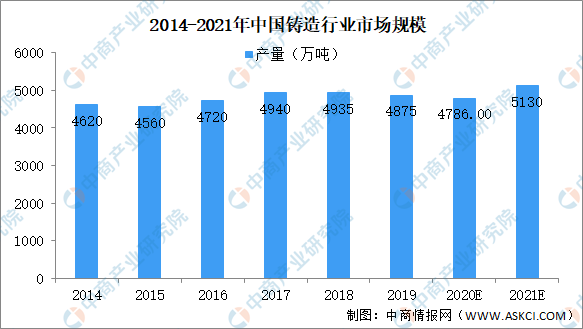受宏觀經(jīng)濟(jì)形勢下行影響,2015年我國鑄件十年來首次出現(xiàn)負(fù)增長,2016年產(chǎn)量重新恢復(fù)上漲,增速為3.51%,2017年為歷史高位,達(dá)4,940萬噸,同比增長4.66%,截至2019年底,我國鑄件總產(chǎn)量4,875萬噸。2014-2019年,我國鑄件產(chǎn)量呈現(xiàn)波動(dòng)變化態(tài)勢,整體呈現(xiàn)中低速增長,行業(yè)產(chǎn)量仍處于較高的水平。受2020年受新冠疫情影響,鑄鑄造行業(yè)市場規(guī)模有所下降,將達(dá)4786萬噸。由于我國政府采取必要有效措施,預(yù)計(jì)2021年我國鑄造行業(yè)市場規(guī)模將有所回升,預(yù)計(jì)達(dá)到5130萬噸。