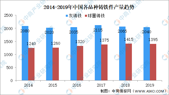 從不同材質(zhì)鑄鐵件產(chǎn)量來看,2014-2019年灰鑄鐵產(chǎn)量整體維持在2,000萬噸以上;2014-2019年球墨鑄鐵產(chǎn)量從1,240萬噸增長到1,395萬噸,年復(fù)合增長率為2.38%。