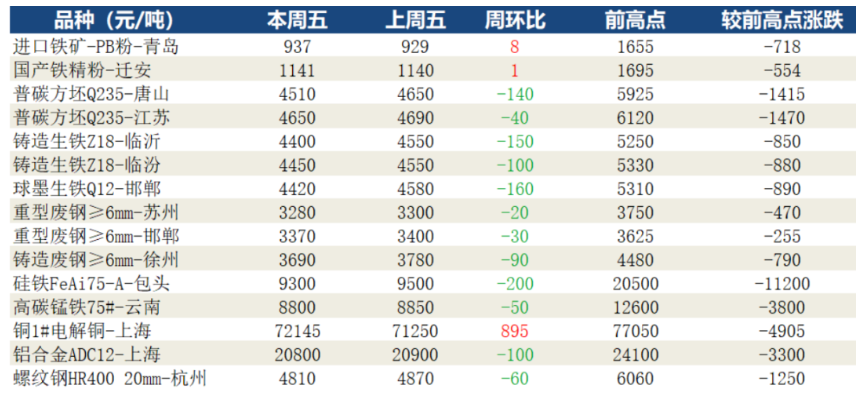原料市場(chǎng)受鋼材降價(jià)、鋼廠利潤(rùn)較低,需求偏弱等原因影響,本周價(jià)格整體呈穩(wěn)中下行趨勢(shì),進(jìn)口礦現(xiàn)貨價(jià)格小幅震蕩,國(guó)產(chǎn)礦價(jià)格偏弱運(yùn)行,市場(chǎng)成交一般。鋼坯、廢鋼、生鐵價(jià)格均受鋼材大幅下跌影響緊跟下降,成交一般。鐵合金價(jià)格維穩(wěn)運(yùn)行,成交偏弱,商家多以觀望為主。銅鋁市場(chǎng)因國(guó)內(nèi)現(xiàn)貨供應(yīng)偏緊,價(jià)格保持中小幅上揚(yáng)。