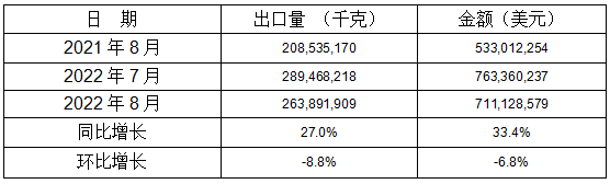 1-8月鋁合金車輪共計(jì)出口59.6萬噸,同比增長-11.5%。其中:8月份出口7.5萬噸,同比增長-9.0%,環(huán)比增長-6.6%,見表7和表8;