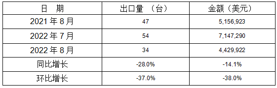 1-8月冷室壓鑄機(jī)共計(jì)出口313臺,同比增長5.4%。其中:8月份出口34臺,同比增長-28.0%,環(huán)比增長-37.0%,見表9和表10;